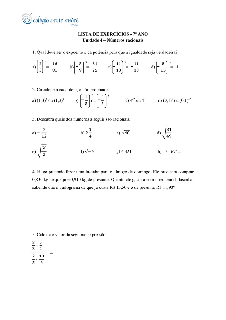 Lista De Exercicios 7º Ano Unidade 4 Numeros Racionais 1